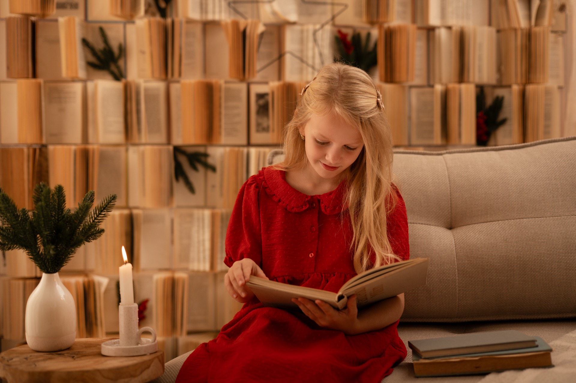 Zeď z reálných knih decentně dozdobená vánoční tématikou v bílých a béžových odstínech.
