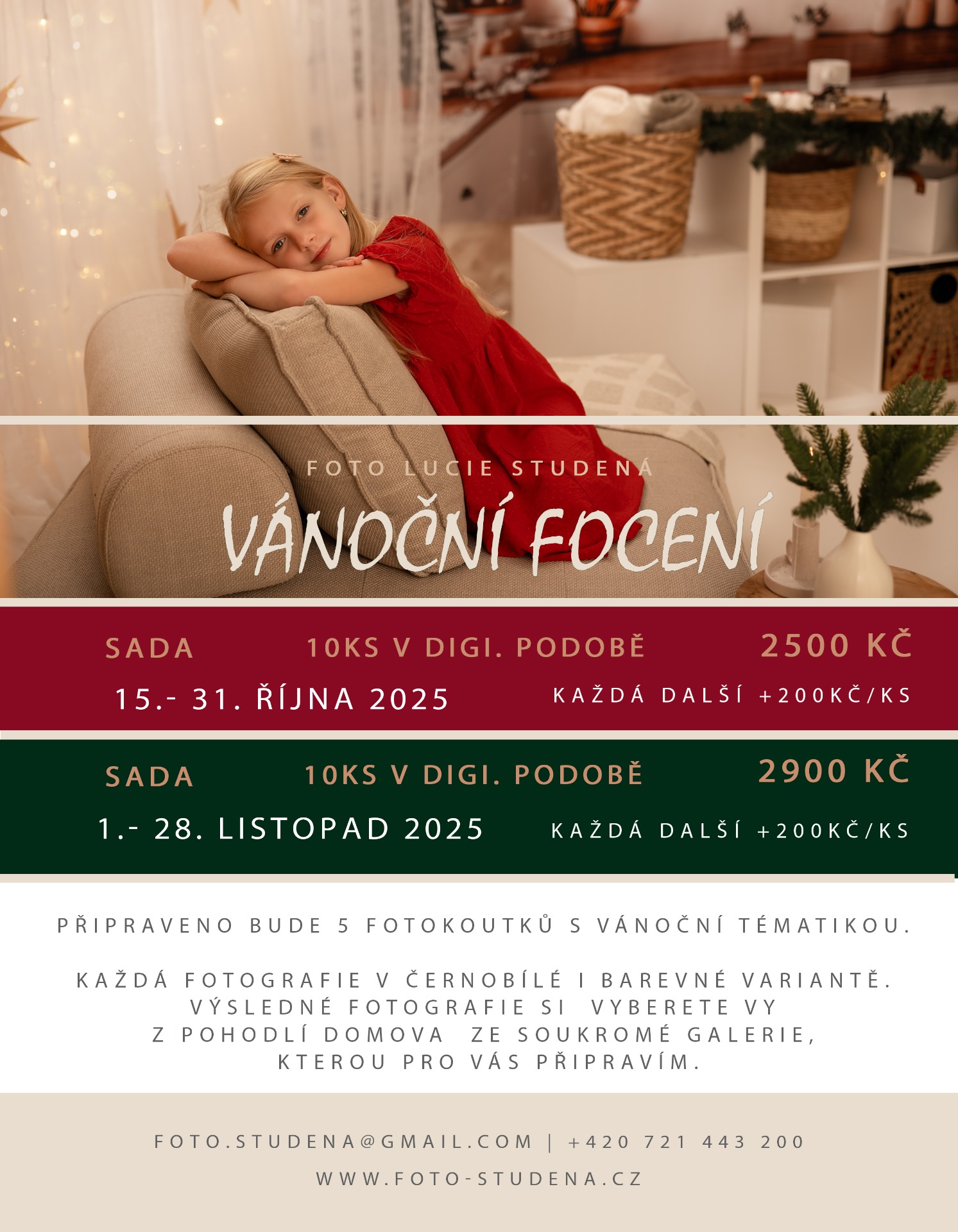 Vánočně bude (jako každý rok) vyzdobené celé studio. + Bude prostor fotit na bílém nebo černém pozadí - bez tématu. Je tedy možné spojit Vánoce třeba s focením narozenin, kdy právě na bílém pozadí přichystám narozeninovou scénu. Nicméně toto nedoporučuji u malých dětí (1-2 roky). Často je to pro děti příliš náročné a dlouhé. V tomto případě je spíše lepší rozdělit na 2 dny.